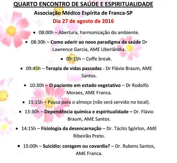 No dia 27 de agosto, a Associação Médico Espírita de Franca realiza o Quarto Encontro de Saúde e Espiritualidade. A iniciativa acontece no Salão Anália Franco, dentro da Escola Pestalozzi – Unidade I.