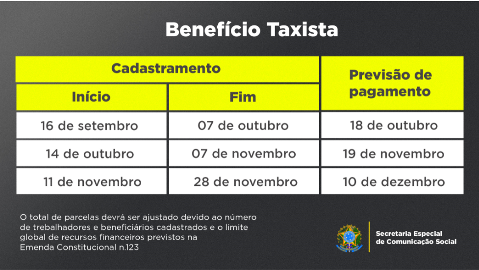 As prefeituras também devem enviar informações de cadastro dos taxistas até o dia 7 de novembro. O processamento das informações pela Dataprev, para identificação dos elegíveis, ocorrerá no período de 9 a 15 de novembro.